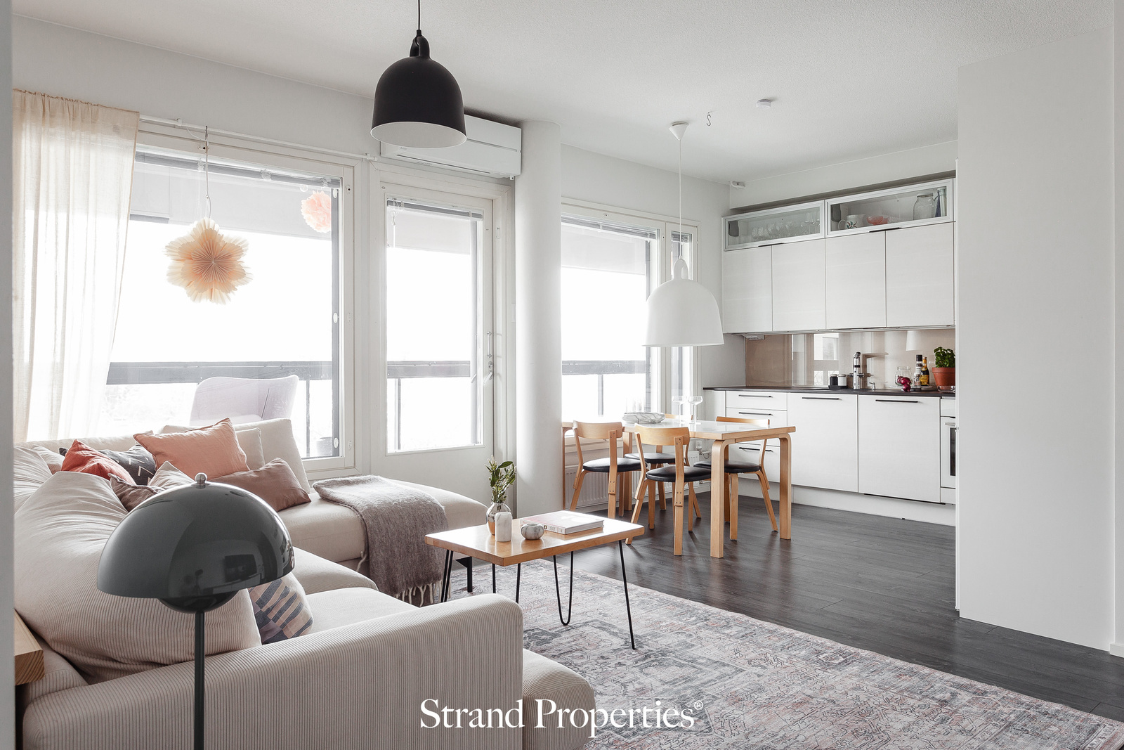 Olohuone, ruokailutila ja keittiö ovat yhtenäistä tilaa, johon tulvii valoa kodin suurista ikkunoista.