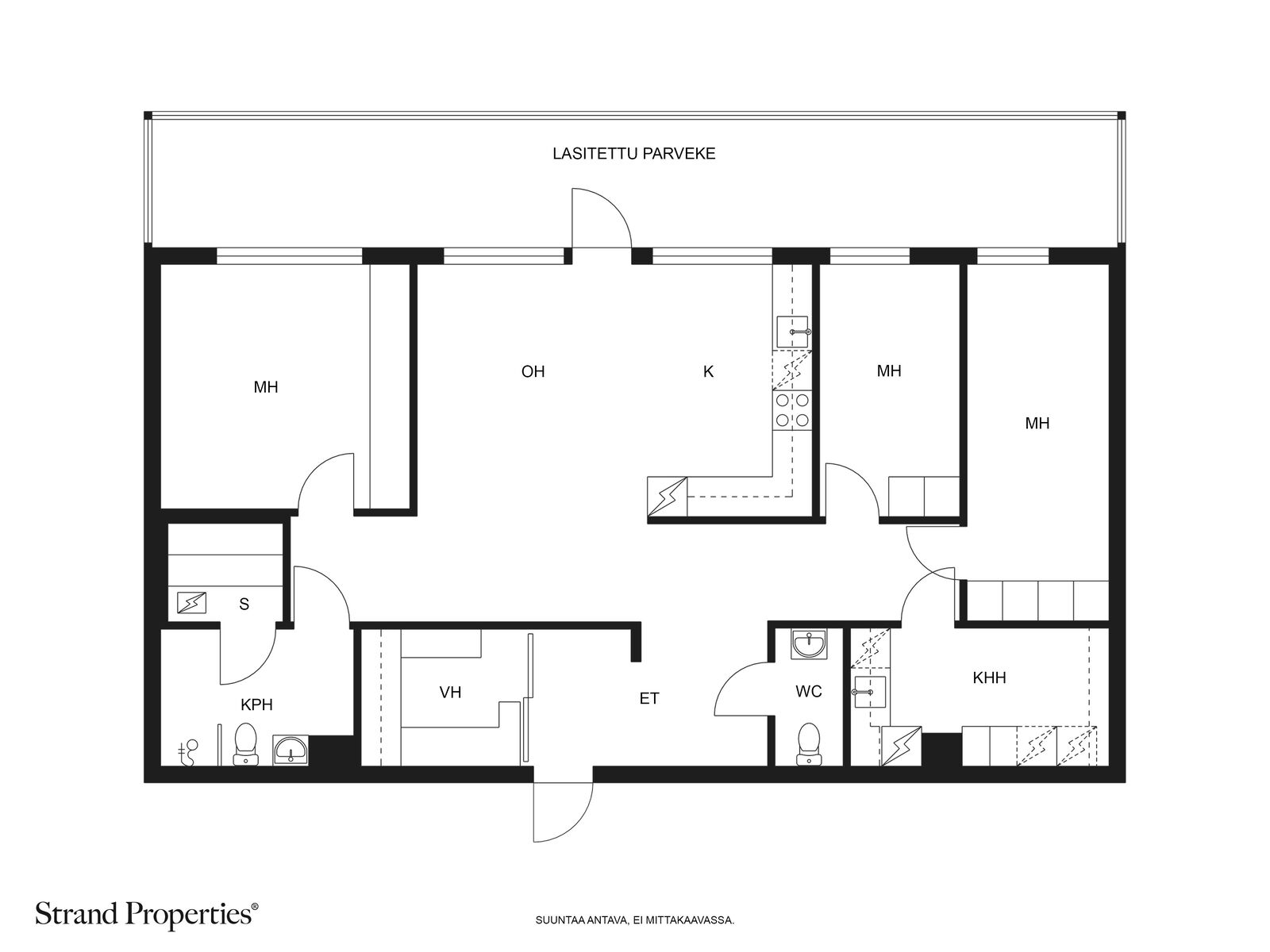 Kodin makuuhuoneet sijoittuvat lounaan suuntaan ja niissä kaikissa on kiinteät kaapistot.