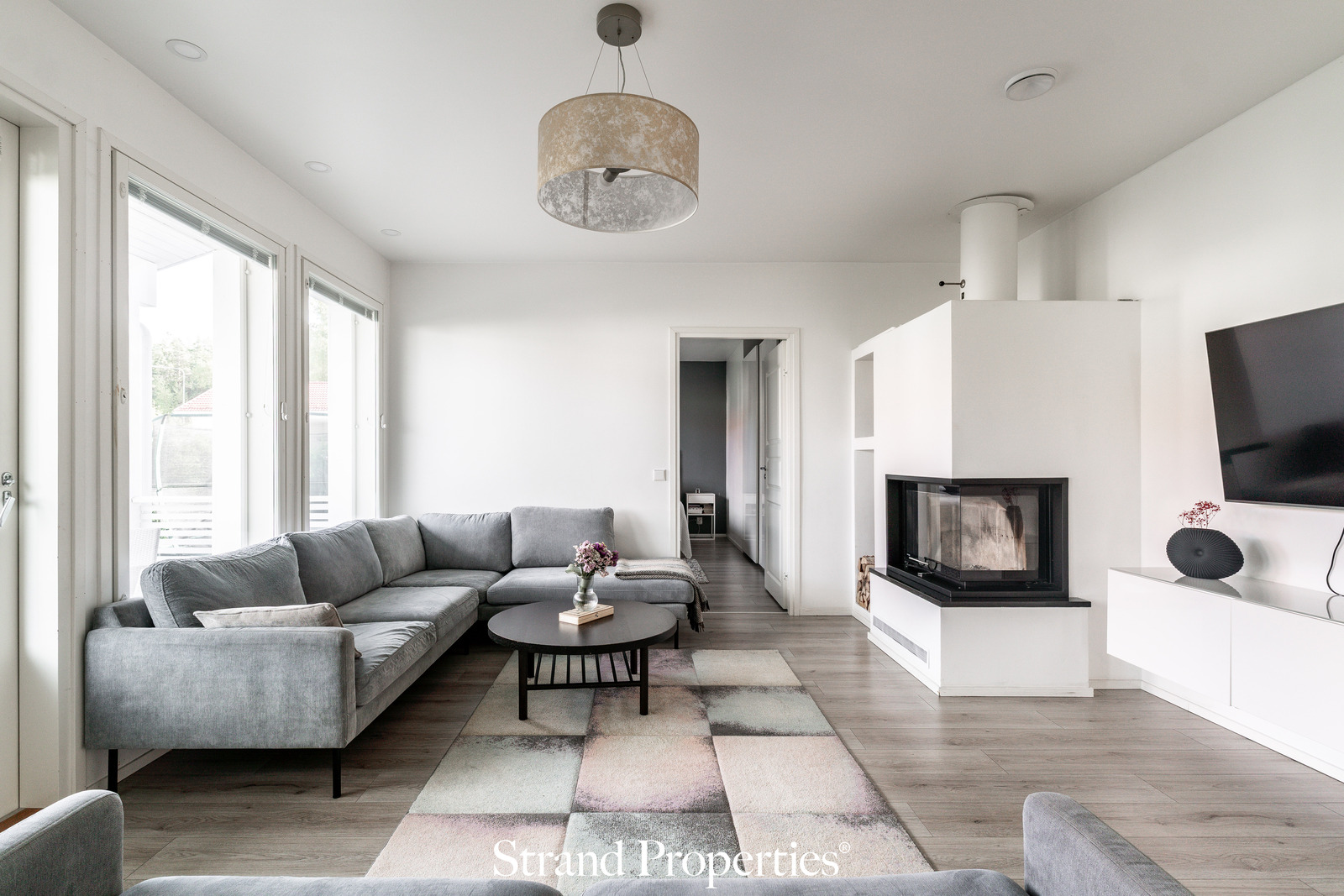 Myynnissä on nyt tyylikäs omakotitalo, jossa yksityiskohdat on harkittuja. Kolmen makuuhuoneen lisäksi yläkertaan on helppo laajentaa lisätilaa tarpeen mukaan. Asuinkerroksen sydämenä on avara ja valoisa olohuone, josta avautuu kulku takapihan terassille – täydellinen paikka grillaamiseen ja kesä-päivän viettoon.