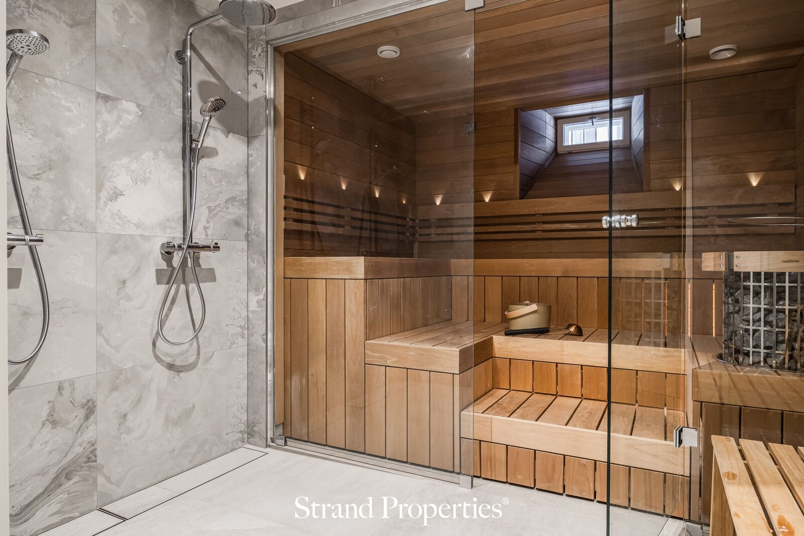 The spacious living area is combined with a modern island kitchen, the bedrooms are located on the side of the peaceful courtyard and one of them has its own balcony. The apartment also has a cozy private sauna.