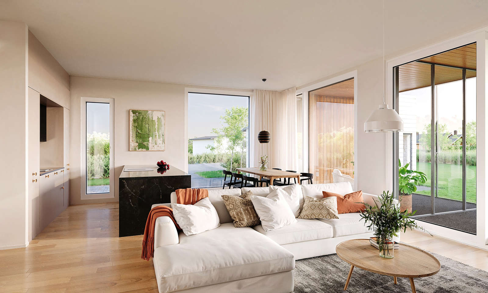 Keittiö ja olohuone muodostavat kodin sydämen: valo kulkee tilan läpi, näkymät avautuvat ulos ja tunnelma on yhtä aikaa moderni ja lämmin. Tämä on tila, jossa kokataan, viihdytään ja eletään – vähän paremmin.