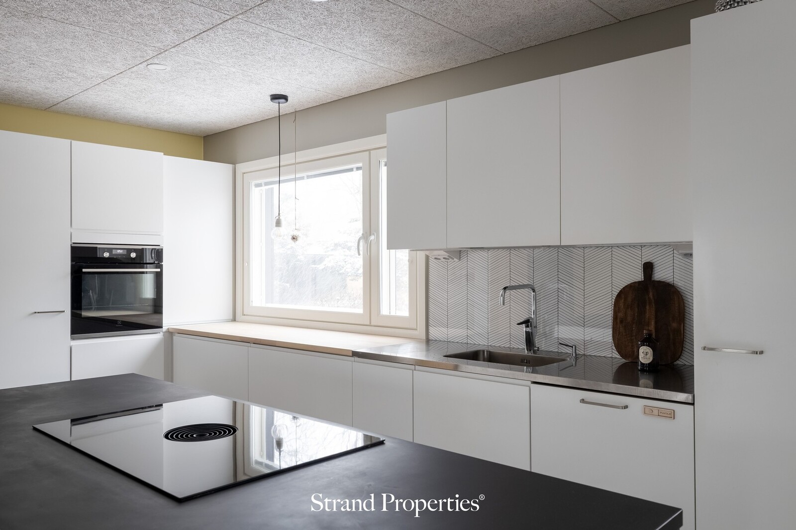 Talo on mittavasti ja tyylillä remontoitu talon alkuperäissielua kunnioittaen – täällä ei ole tingitty laadusta, ratkaisuista eikä tunnelmasta. Taitavasti yhdistetty 50-luvun yksityiskohdat modernimpaan ajattomaan kokonaisuuteen. Kodin sydän on valtava unelmakeittiö, joka on syntynyt rohkealla ja harkitulla seinien avaamisella. Kahden huoneen kokoinen tila kutsuu kokkaamaan, leipomaan ja viihtymään yhdessä. Iso saareke kokoaa perheen ja ystävät yhteen, aamiaiskaappi ja aamiaispöytä tekevät arjesta sujuvaa ja nautinnollista ja moderni induktioliesi integroidulla liesituulettimella viimeistelee tyylitellyn kokonaisuuden. Tämä on keittiö, jossa syntyvät niin arjen pastat kuin juhlan pitsat ja joulun piparit.