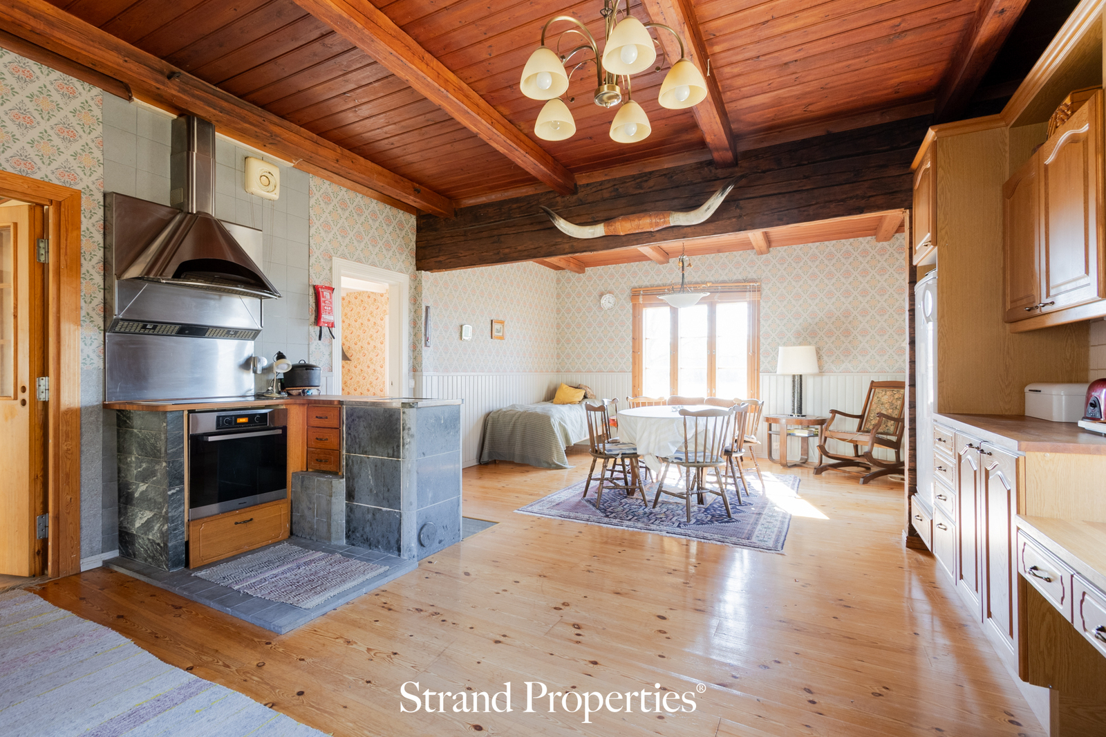 Olohuoneessa korostuvat hirsiseinien lämmin tunnelma ja varaava takka, joka luo kodikasta lämpöä ja toimii myös energiatehokkaana lisälämmönlähteenä. Keittiö on varusteltu arjen tarpeisiin ja tarjoaa hyvät puitteet niin ruoanlaittoon kuin yhdessäoloon. Pesutiloja löytyy sekä keskikerroksesta että yläkerrasta, ja erillisiä wc-tiloja on kolme – käytännöllinen ratkaisu isommassakin taloudessa.