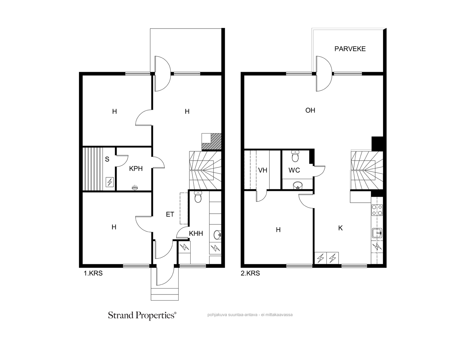 Asunto jakautuu kahteen tasoon, mikä tuo arkeen selkeyttä ja tilan tuntua. Alakerrasta löytyvät kaksi makuuhuonetta, tunnelmallinen takkahuone, saunaosasto, sekä käytännöllinen kodinhoitohuone. Takkahuoneesta on käynti terassille, josta avautuvat suojaisat näkymät sisäpihalle luoteen suuntaan.