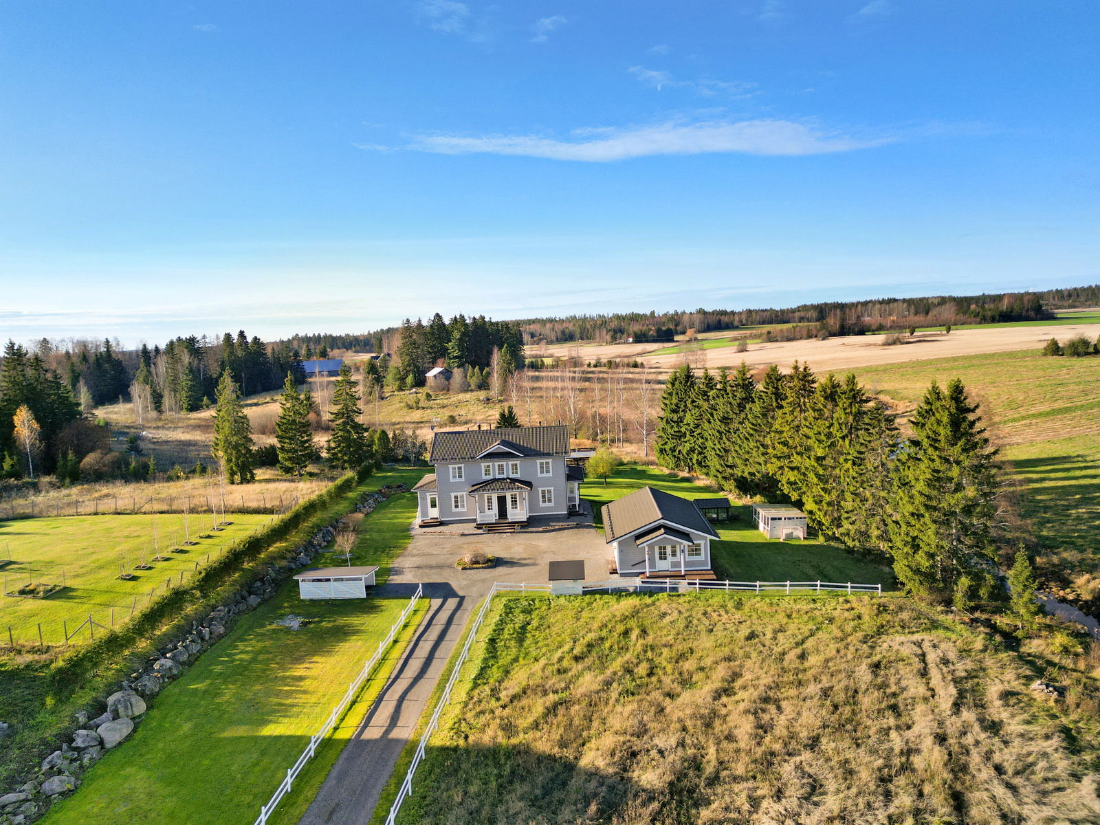 Maaseudun rauhasta vapautumassa suuri maalämpötalo isolla autotallirakennuksella ja pihasaunalla, jonka tilava tontti rajoittuu rakentamattomaan peltoon.
