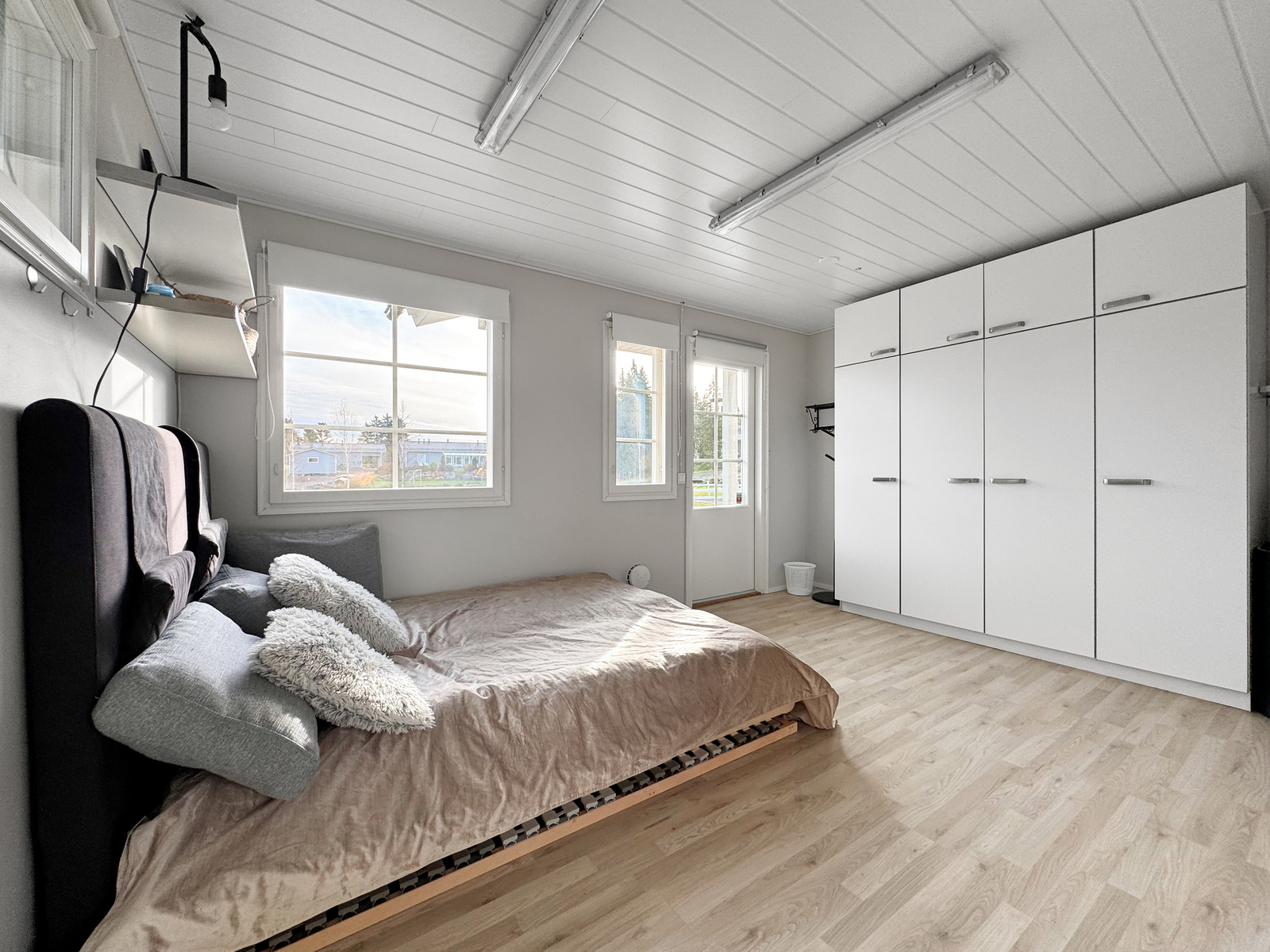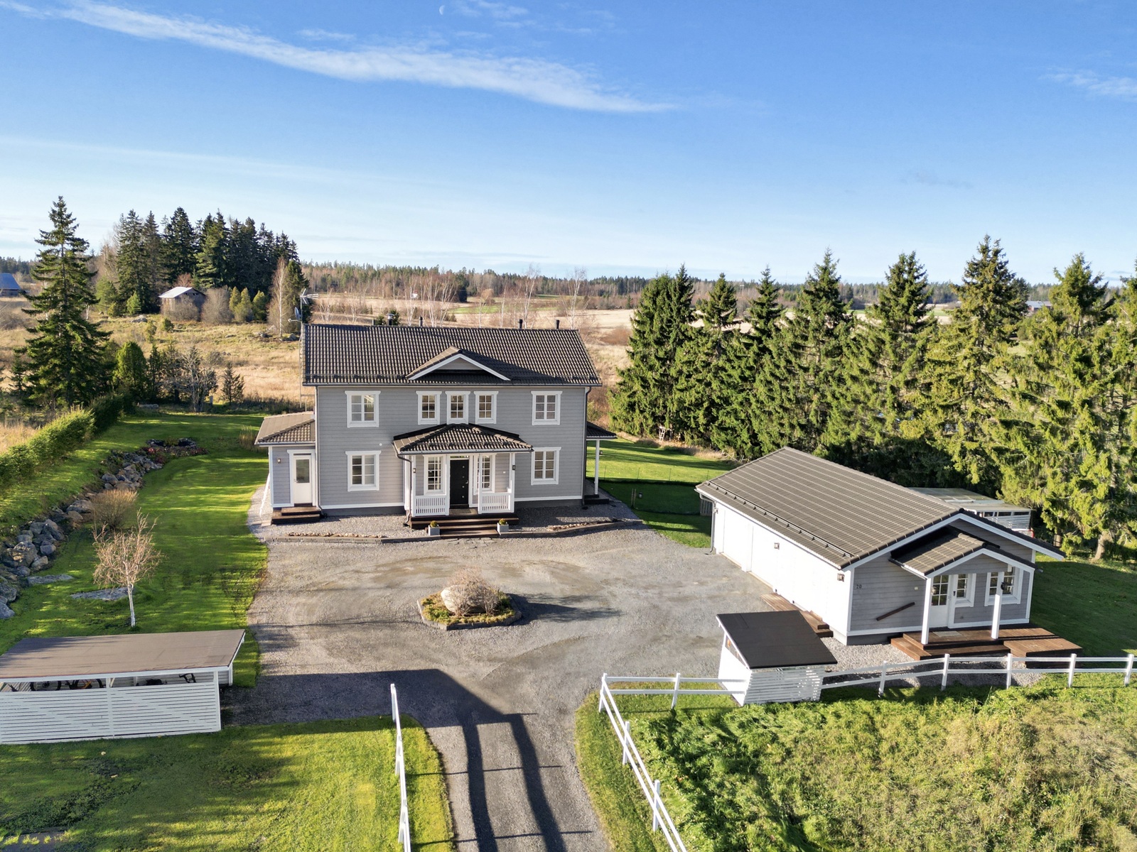 Ympäri jaettava etupiha on autoliikenteen kannalta erittäin helppokäyttöinen ja toimiva useammankin auton kanssa. Maalämmöllä lämpenevästä tallista löytyy tilat kahdelle autolle sekä harrastevälineille ja tallirakennuksen päässä erillinen työhuone.