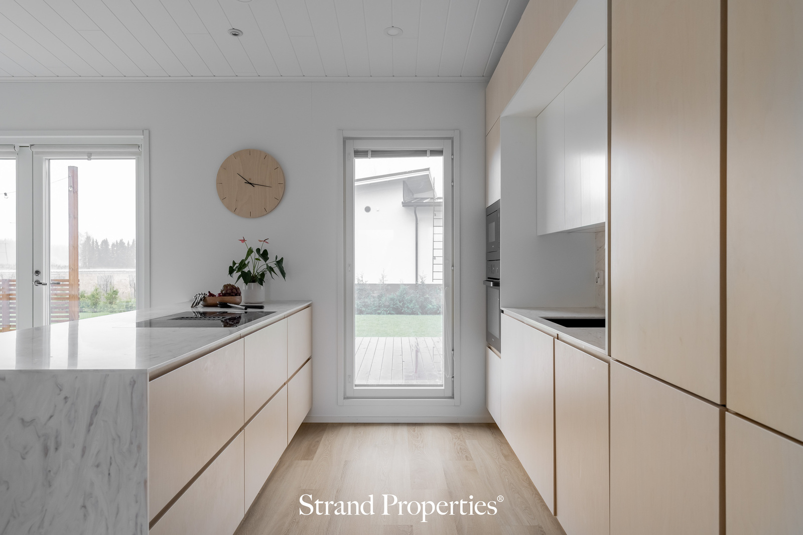 Onnistunut ja toimiva 121 asuinneliön pohjaratkaisu takaa sujuvan arjen lapsiperheelle. Kodin skandinaavinen tyyli ja harmoniset materiaalivalinnat miellyttävät silmää vielä pitkälle tuleviin vuosiin. Avarat yhteiset tilat kutsuvat perheen yhteen ja jopa neljän makuuhuoneen ansiosta jokaiselle on tarjolla myös yksityisyyttä. Tilava vaatehuone tuo oman käytännöllisen lisänsä päämakuuhuoneeseen.