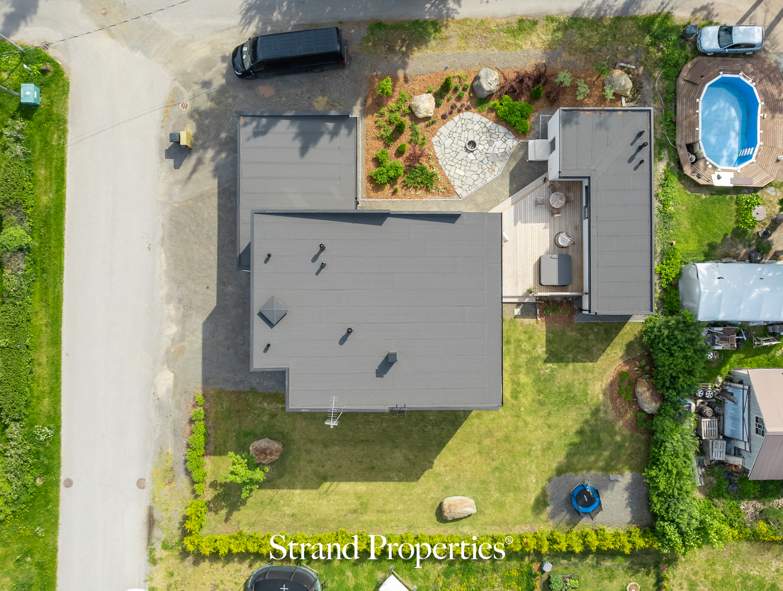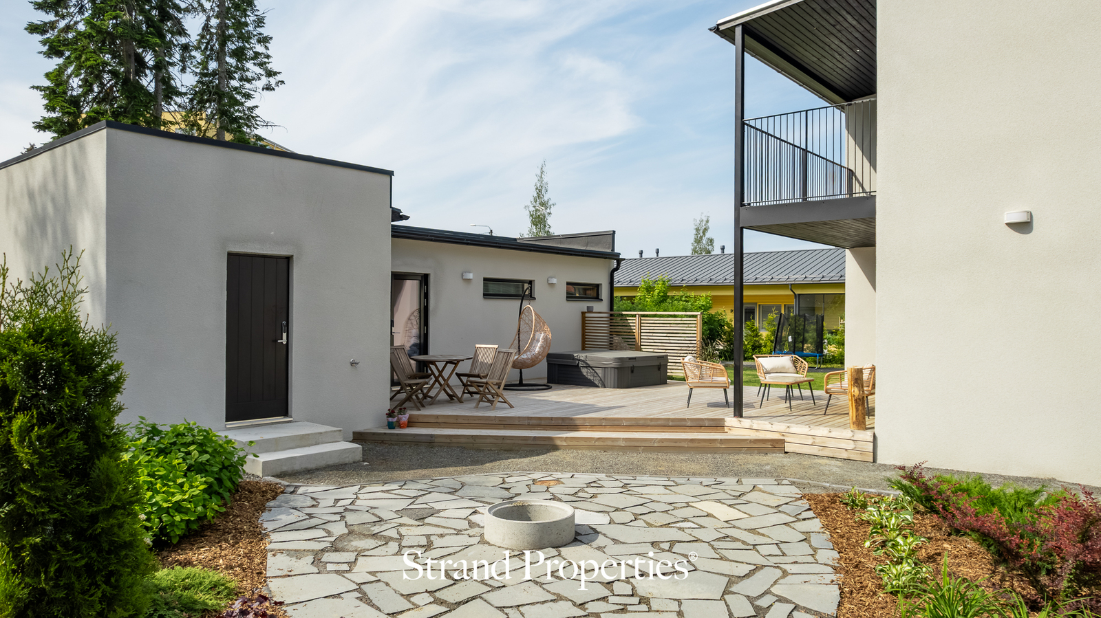 Keittiö on moderni ja toiminnallinen, varustettuna laadukkailla kodinkoneilla. Keittiö, ruokailutila ja olohuone muodostavat yhtenäisen avaran kokonaisuuden, jossa on tilaa niin perheen yhdessäoloon, kuin isommankin vierasporukan viihdyttämiseen. Tilan keskipisteenä on upea varaava takka. Ruokailutilasta on käynti omalle terassille, jossa luksuksena on upotettu poreamme ja ylellinen pihasauna. Saunan tupa toimii helposti myös vierashuoneena ja tilassa on myös erillinen wc. Talon kolme makuuhuonetta sijaitsevat yläkerrassa ja master bedroomin yhteydessä on kaunis walk-in tyylinen vaatehuone. Yläkerran kylpytiloihin spa-fiilistä luo tilava kylpyamme. Talon yhteydessä on kahden auton autokatos.