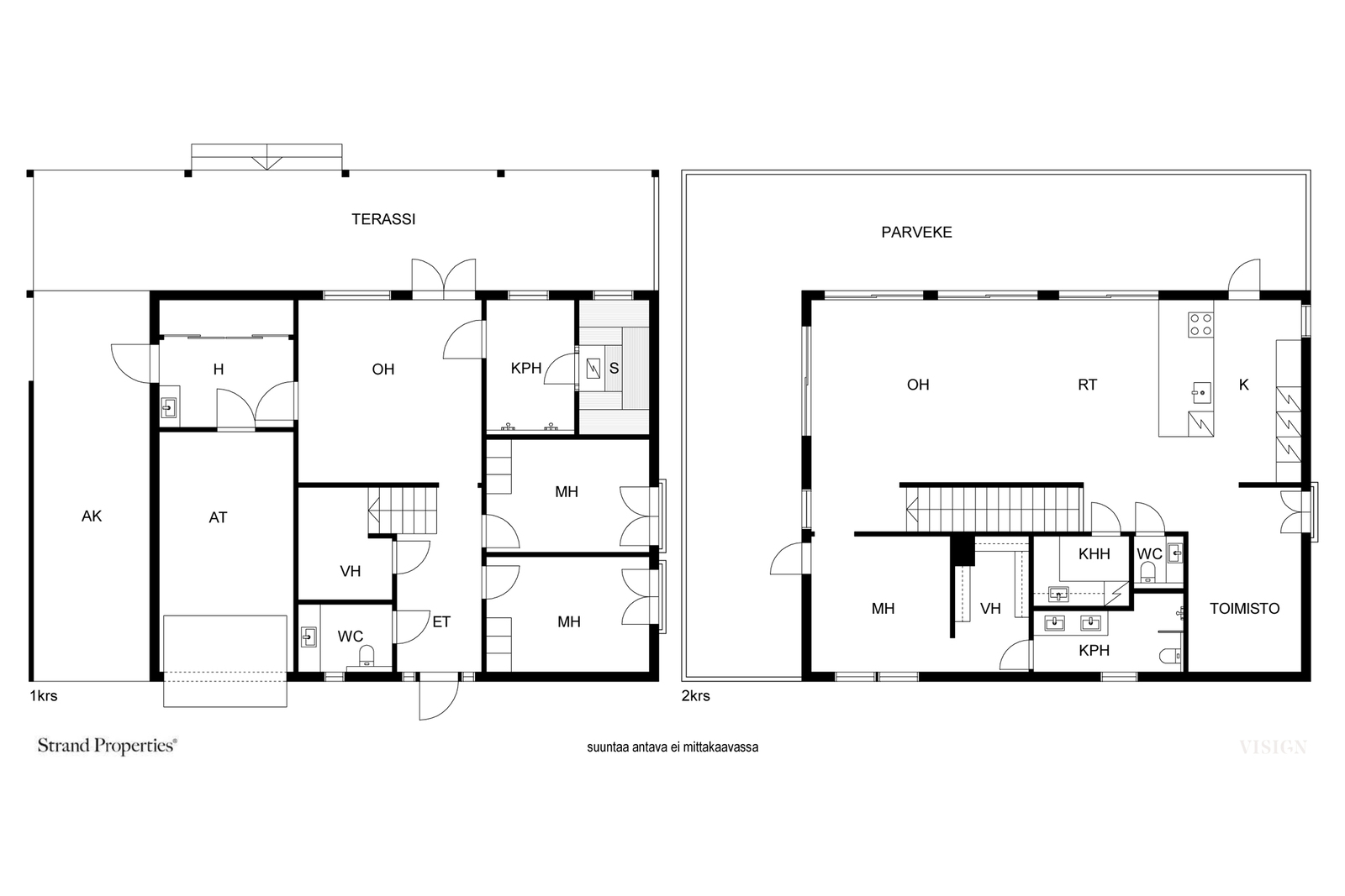 Yläkerta on avara ja valoisa kokonaisuus, jossa huippumoderni keittiö suuren saarekkeen kera yhdistyy viihtyisään olohuoneeseen. Avonainen työtila toimii erinomaisesti kotitoimistona, mutta on helposti muutettavissa lisämakuuhuoneeksi. Päämakuuhuoneen yhteydessä sijaitsee ylellinen pukeutumishuone sekä oma en suite -kylpyhuone. Koko yläkerran kiertävä terassi toimii upeana jatkeena sisätiloille - suurista liukuovista kulku kesäisin kuin suoraan olohuoneesta ulkoilmaelämään.