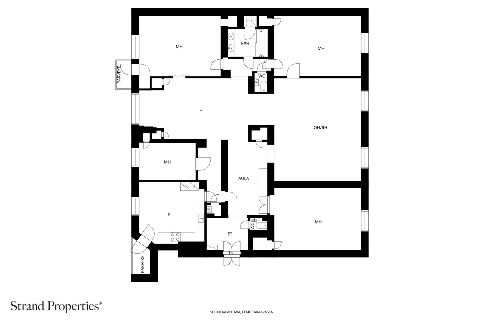 Scavolinin keittiö on varusteltu integroiduilla kodinkoneilla ja kestävällä kivitasolla. Keittiöstä on lisäksi kulkuyhteys Kristiinankadun puolella sijaitsevaan rappuun oman sisäänkäynnin ja toisen parvekkeen kautta.