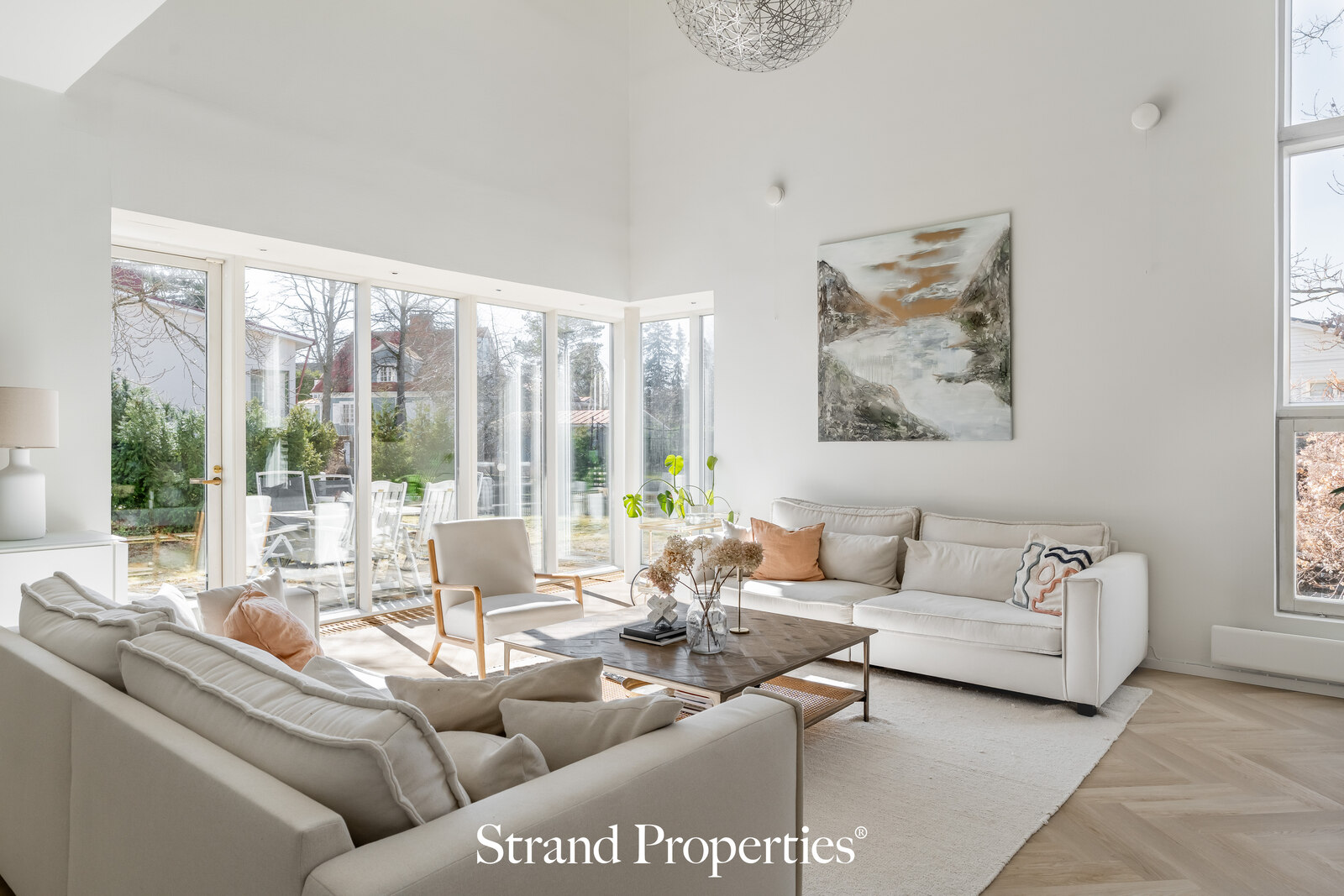 Huoneisiin muodostuu oma tunnelmansa suurten ikkunoiden, korkeiden tilojen ja harkittujen näkymien ansiosta – valo kulkee tilasta toiseen ja tekee kodista elävän.