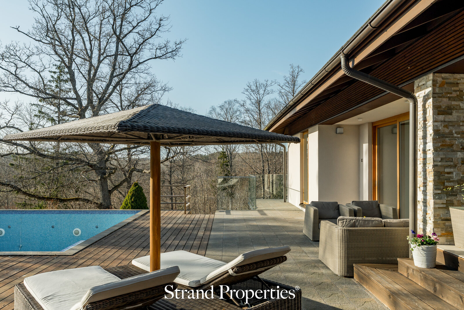 Kallioiselle rinnetontille sijoittuva L-muotoinen kivitalo avaa kauniit näkymät ympäristöön ja muodostaa suojaisan, syleilevän takapihan oleskeluun. Piha-alueen tasoerot jäsentävät kokonaisuuden selkeiksi alueiksi, joista jokainen palvelee omaa käyttötarkoitustaan. Vuonna 2014 rakennettu uima-allas sijoittuu aurinkoiselle terassille ja luo lähes infinity pool -vaikutelman.