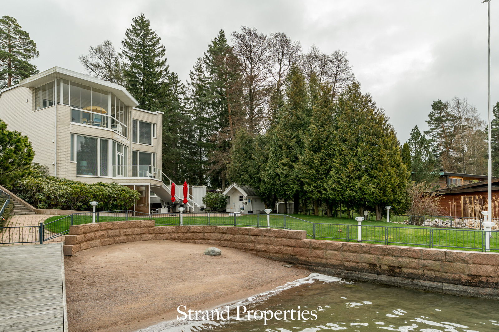 Kolmeen kerrokseen rakentuva koti tarjoaa ylellistä arkea, jonka kruunaavat oma hiekkaranta, venelaituri isolle veneelle ja kahden auton lämmin talli. Sisään astuessa katse kiinnittyy keskikerroksen avaraan ja valoisaan tilaan – olohuone ja keittiö muodostavat yhtenäisen kokonaisuuden, jossa luonnonvalo tulvii sisään suurista ikkunoista. Olohuoneesta pariovet johdattavat suoraan tilavalle parvekkeelle, jolta avautuvat näkymät merelle.