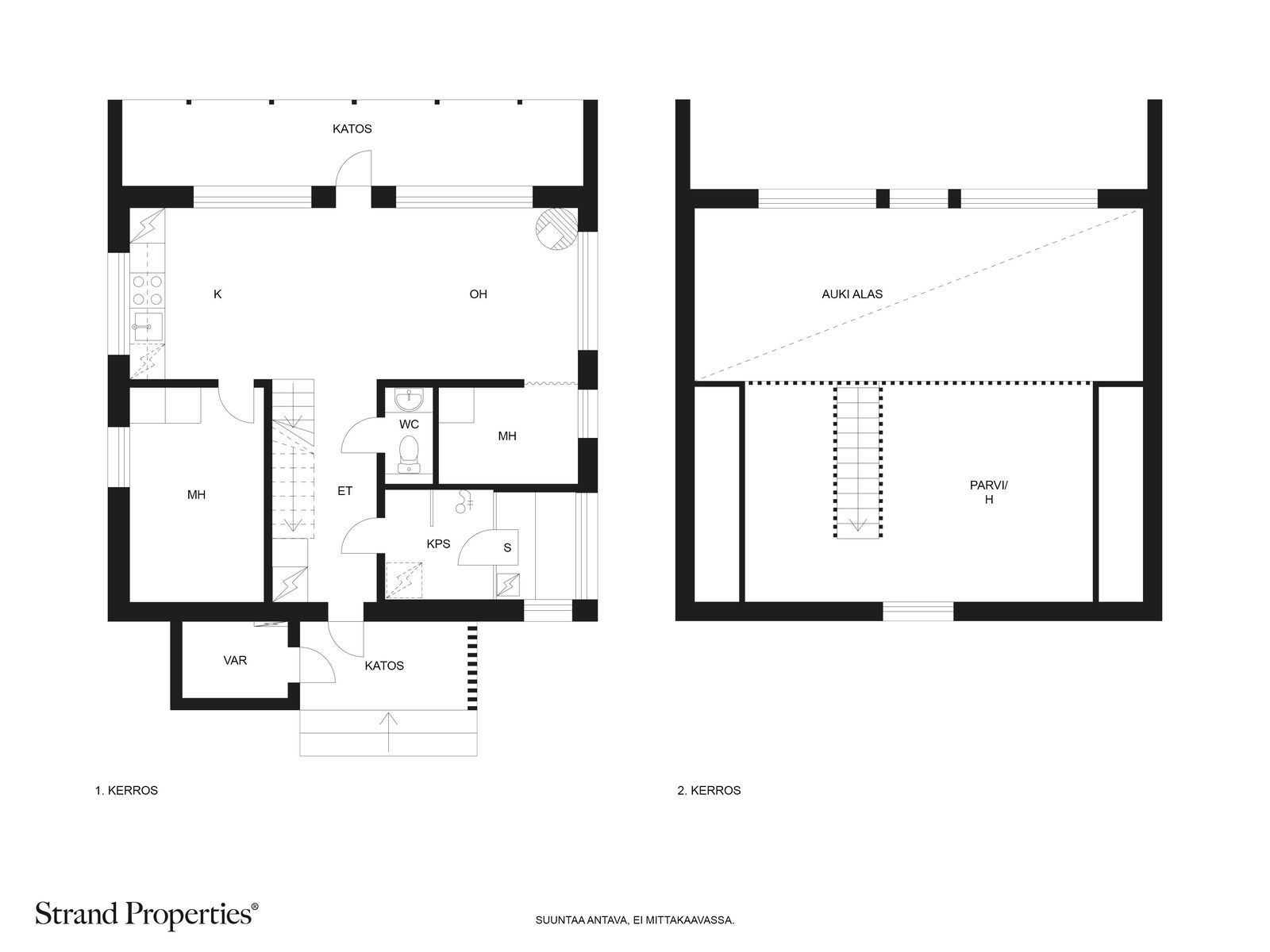 Asuminen sijoittuu kahteen kerrokseen. Alakerrassa on yhdistetty oleskelutila sekä keittiö, josta avautuu suurien ikkunoiden kautta rauhoittava luontomaisema, ja lämpimän tunnelman takaa kaunis kevyttakka. Lisäksi ensimmäisestä kerroksesta löytyy yksi makuuhuone sekä pienempi makuutila, ja parvella on tilaa parisängylle. Ratkaisu toimii joustavasti niin perheen, vieraiden kuin vuokrauskäytönkin tarpeisiin.
