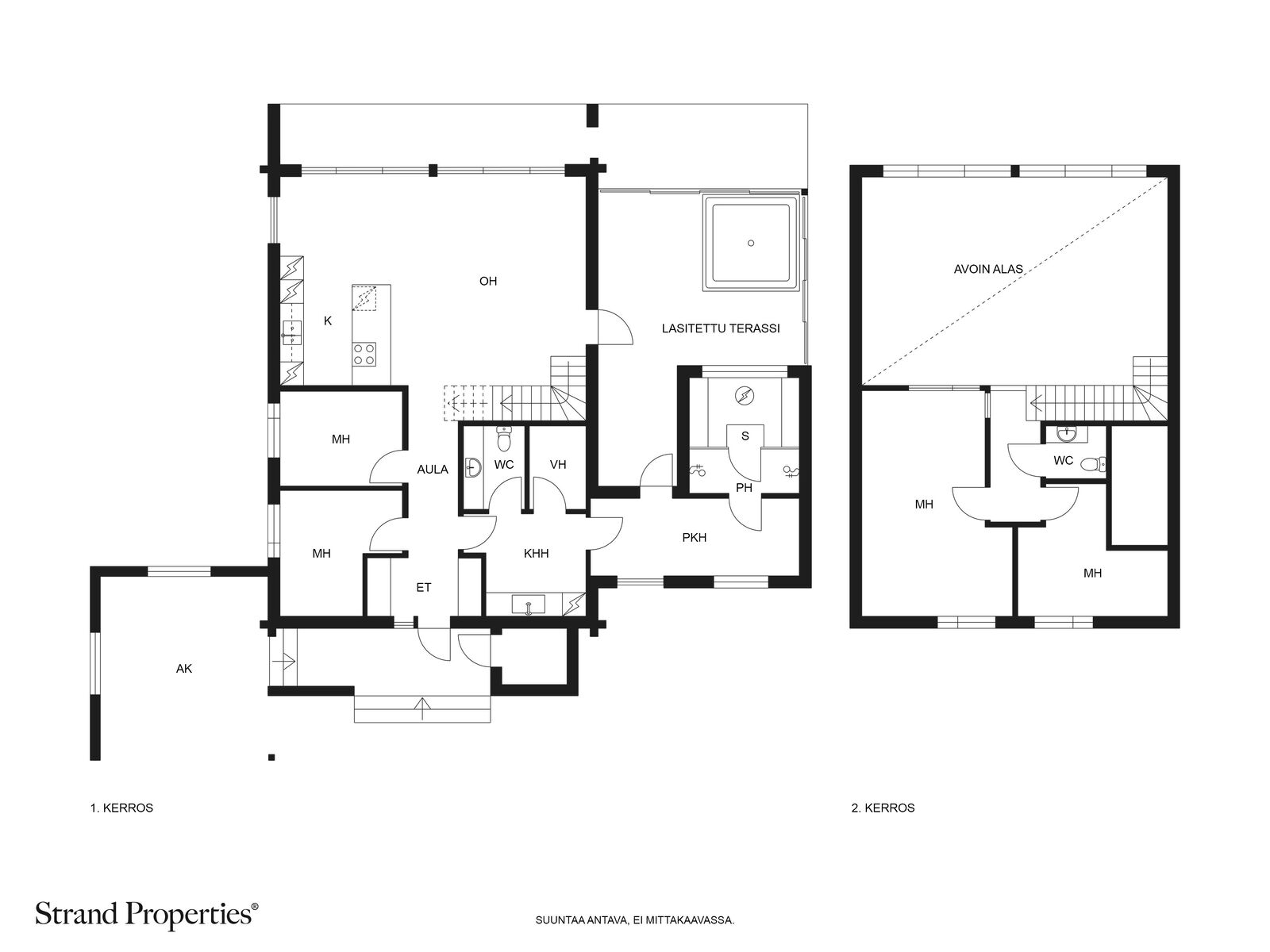 Toisen kerroksen master bedroomista avautuu näyttävä näkymä lasiseinän läpi oleskelutilaan, mikä lisää avaruuden tuntua ja antaa tilalle persoonallisen ilmeen. Keittiö on varustettu integroiduin kodinkonein, ja saarekkeessa on suodattimella varustettu liesituuletin. Runsaat työskentely- ja säilytystilat palvelevat niin arjen ruoanlaittoa kuin suurempien illallisten järjestämistä. Tilava kodinhoitohuone tarjoaa erinomaiset puitteet pyykkihuollolle ja ulkoiluvarusteiden kuivatukselle.