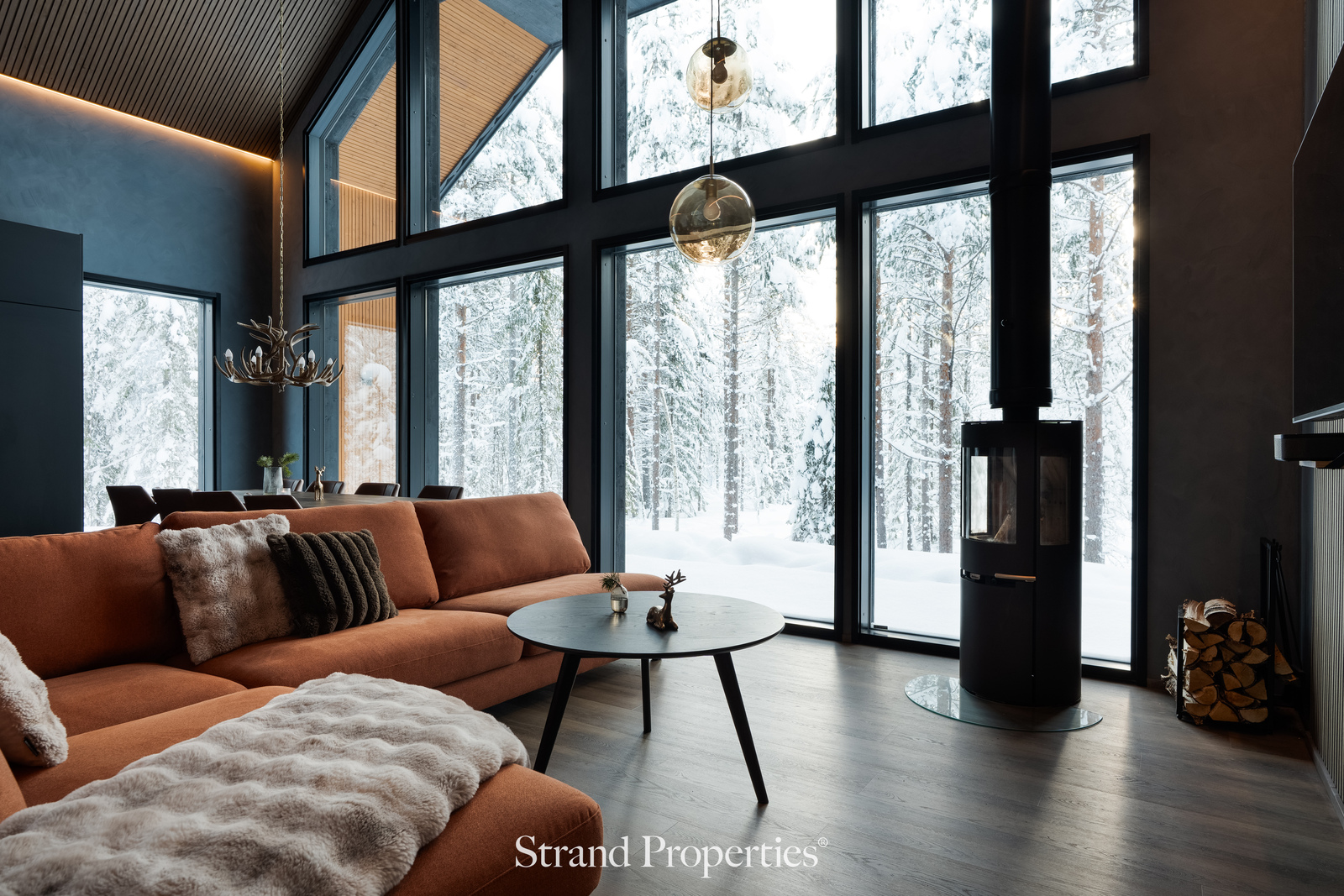 Vuosi sitten käyttöönotettu korkeatasoinen huvila omalla tontilla Levijärven alueella. Kokonaisuus on toteutettu huolella alusta asti, ja suunnittelussa on painotettu sekä näyttävyyttä että käytännöllisyyttä. Tilat on mitoitettu palvelemaan vaivattomasti suurempiakin seurueita, ja neljän makuuhuoneen pohjaratkaisu tarjoaa luontevan tasapainon yhteisten oleskelutilojen ja oman rauhan välillä. Avarat näkymät ja harkitut tilaratkaisut tekevät kokonaisuudesta selkeän ja viihtyisän.