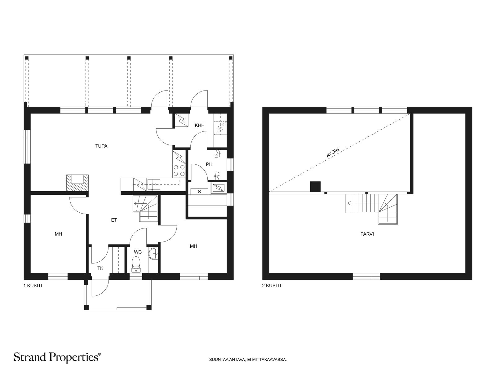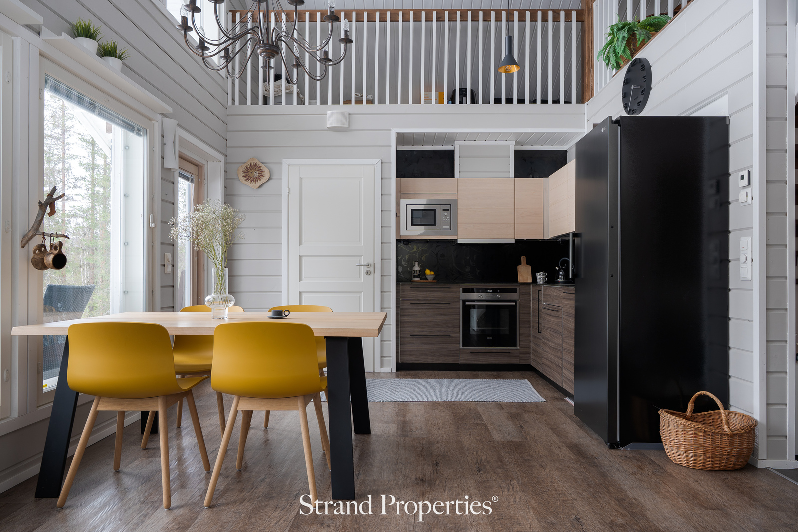 Sisätiloissa korostuvat luonnonvalo ja rauhallinen tunnelma. Tupakeittiön suurista ikkunoista avautuu metsä- ja suomaisema, jossa naapureita ei ole näkökentässä. Alakerrassa sijaitsee kaksi makuuhuonetta sekä tilava eteisaula, joka tuo arkeen käytännöllisyyttä. Pukuhuone ja kodinhoitotila on yhdistetty toimivaksi kokonaisuudeksi, jonka kautta kulku saunaosastolle, ja josta on suora käynti takaterassille vilvoittelemaan saunan jälkeen.