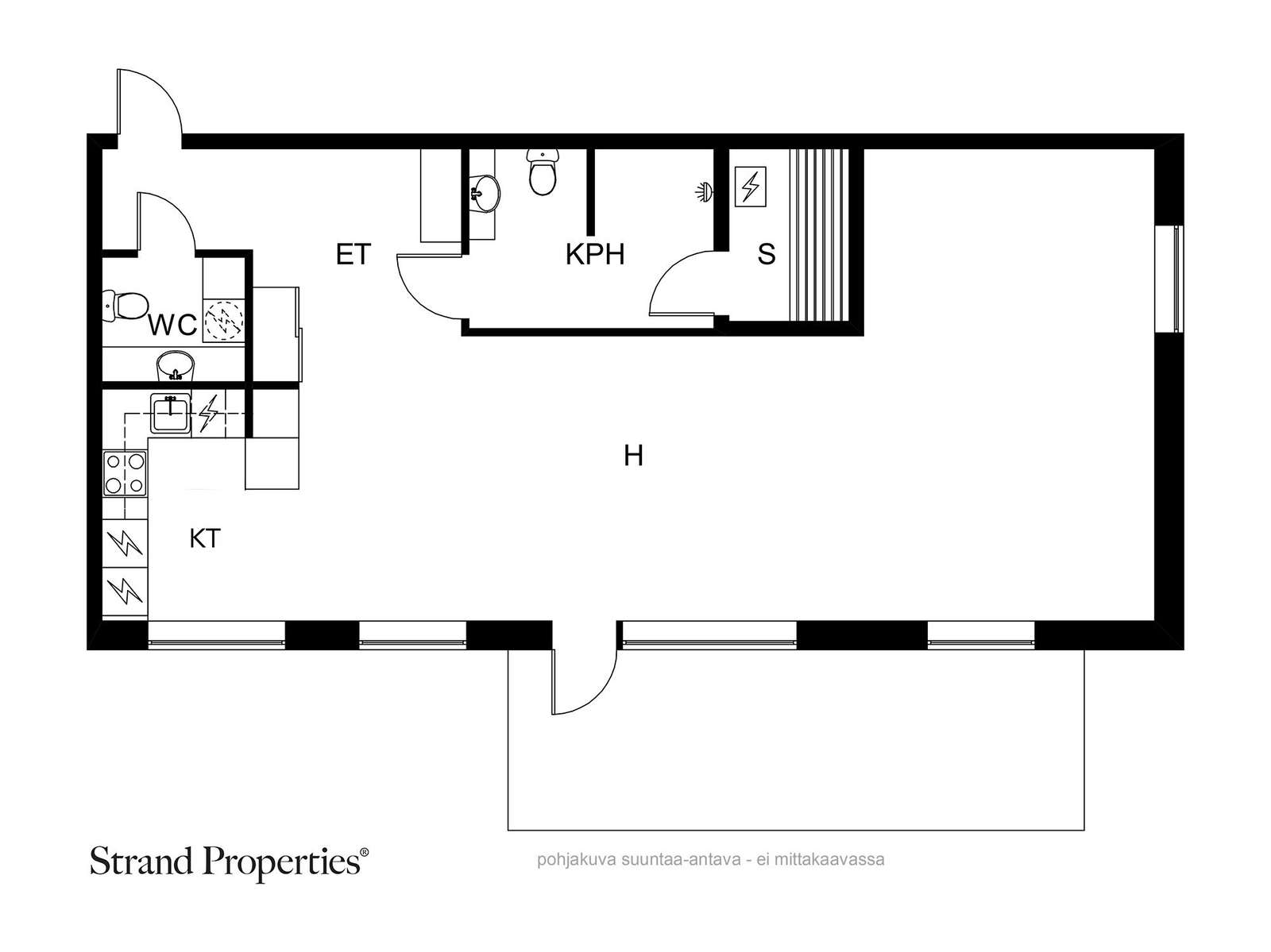Ateljeehenkinen parvekkeellinen huoneisto on nyt avara ja valoisa yksiö, yhtiöjärjestyksen mukaan huoneisto on kuitenkin kolmio, mahdollistaen tarpeen mukaan jopa kahden huoneen rakentamisen.