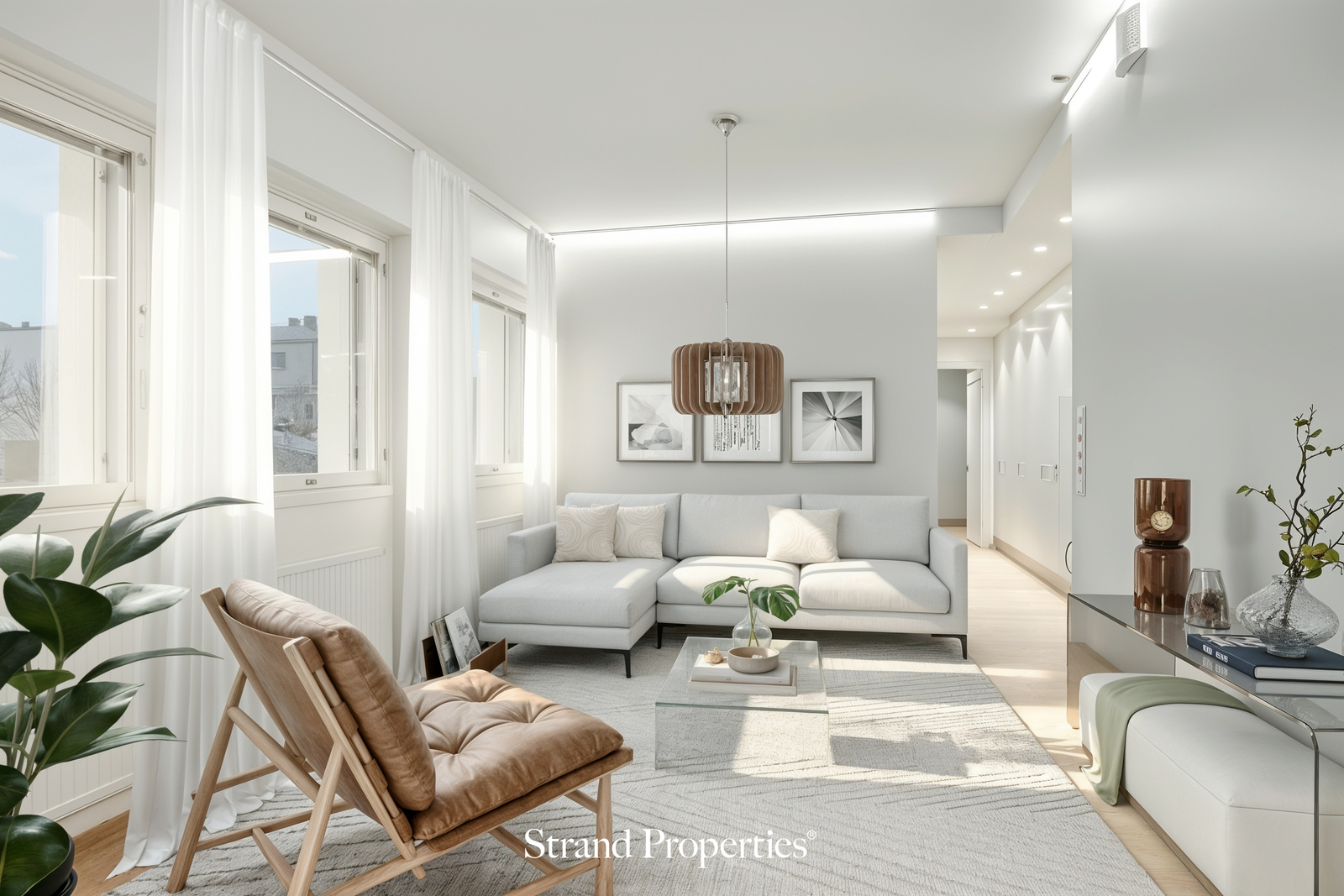 Selkeä pohjaratkaisu – avoin tila ruokailuun ja oleskeluun, kaksi huonetta, kaksi kylpyhuonetta ja sauna vastaavat vaativankin asukkaan tarpeisiin. Sisustussuunnittelun materiaalivalinnat heijastavat hienostunutta ja ajatonta sävymaailmaa, joka luo asuntoon tasapainoisen ja yhtenäisen kokonaisuuden.