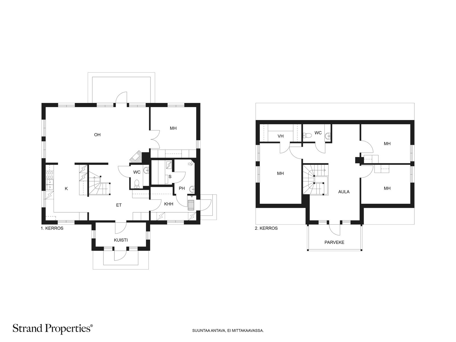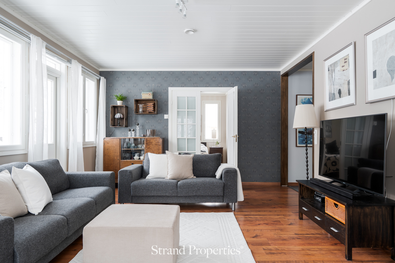Kaksikerroksinen, 145 m²:n koti on toimiva ja selkeä pohjaratkaisultaan. Alakerrassa on avara eteisaula, keittiö ja ruokailutila sekä olohuone, jossa varaava takka ja leivinuuni tuovat lämpöä ja kodikkuutta. Alakerrassa sijaitsee myös yksi makuuhuone, käytännöllinen kodinhoitohuone sekä wc.