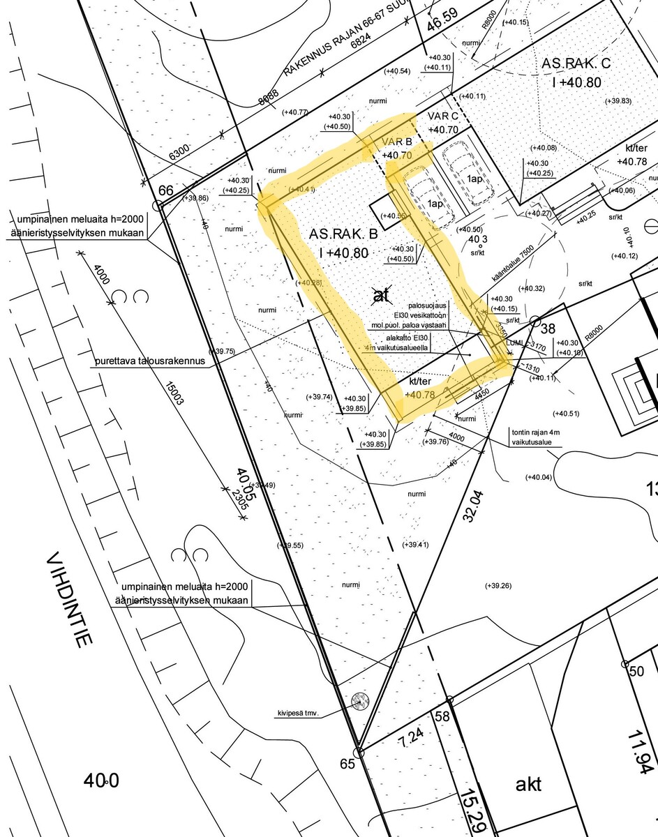 Koko tontille on voimassa oleva rakennuslupa 1 paritalolle. Paritalo jaetaan erillisellä katoksella ääni ja ulkonäköteknisistä syistä. Tontilla oleva "toinen autokatoksella kytkettävä" talo on jo valmis. Kyseessä oleva B-talo on rakennusluvan mukaan 4h+k huoneistoalaltaan 95 m².