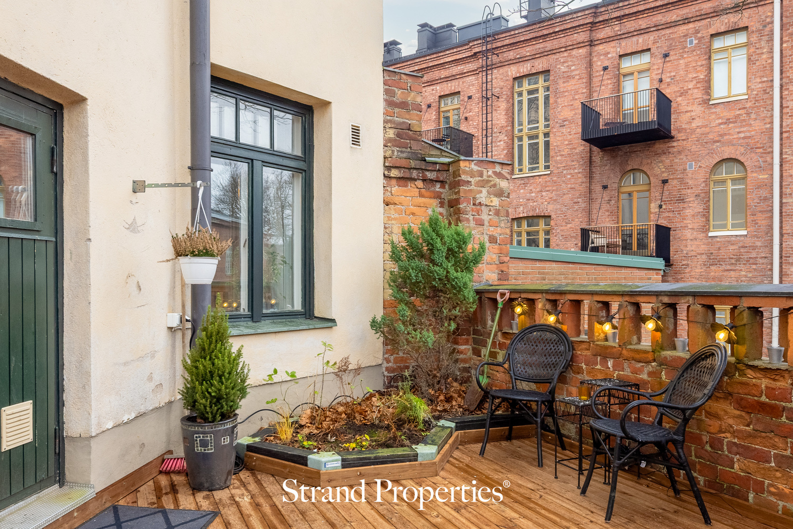 Odotan uteliaana, tuotko mukanasi kenties myös pienet jalat tassuttelemaan pitkin tiilimuurin ympäröimää juuri uudistettua terassipihaani. Vai loihditko meistä koko naapuruston kadehtiman viherkeitaan. Terassini syleilyssä voit nauttia niin kesäaamun auringonpaisteessa kupillisen aamukahvia, syysiltojen lempeydessä lasillisen viiniä kuin talven kuulaudessa mukillisen höyryävää kaakaota. Takaan, että tarjoan aina yhtä valloittavan tunnelman sekä yksin että ystävien ympäröimänä.