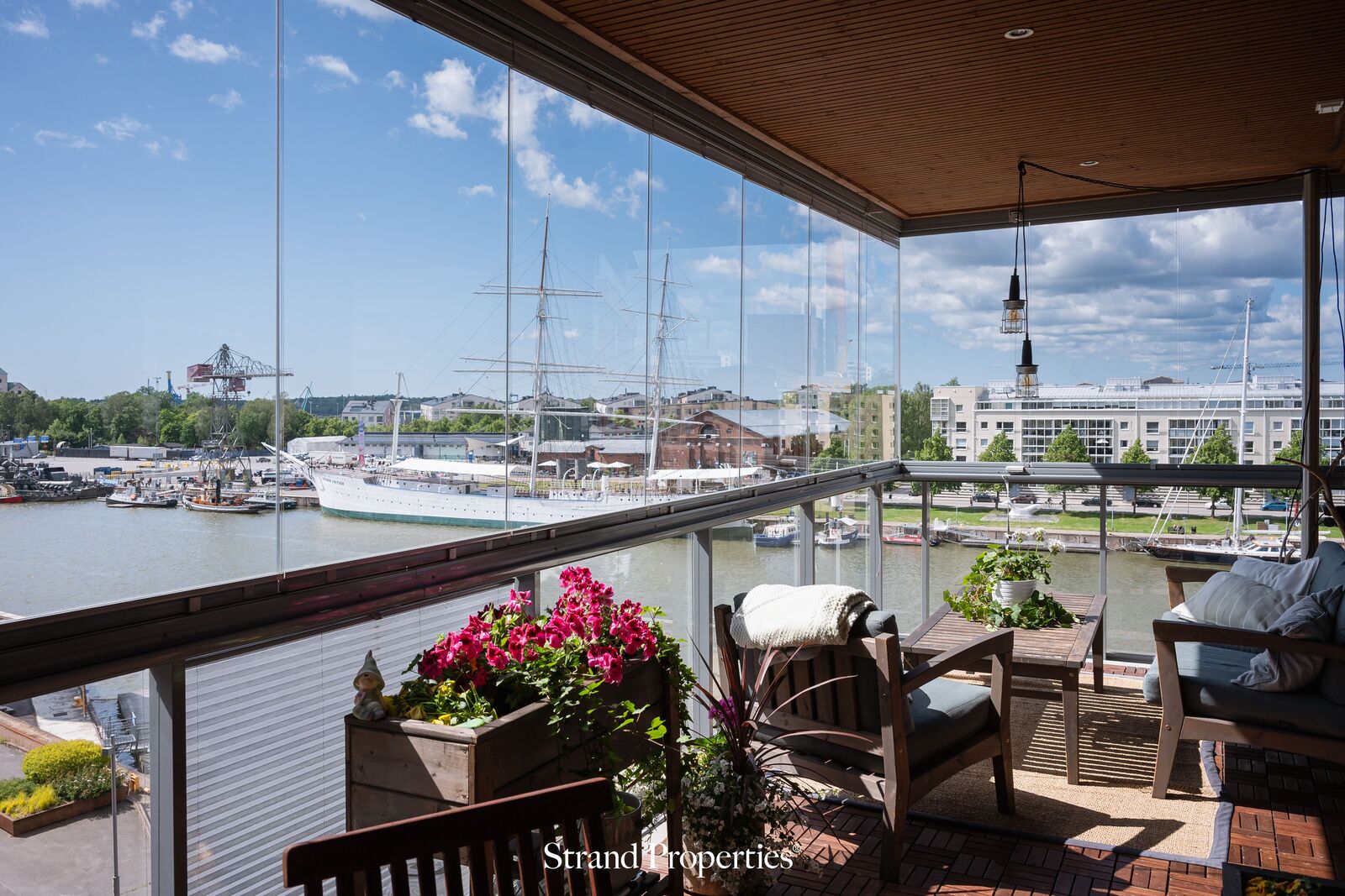 Olohuoneesta on kulku suurelle lasitetulle parvekkeelle, jolta avautuu henkeäsalpaava maisema suoraan Aurajoelle ja sen jokilaivoihin. Näkymä on kuin postikortti, joka elää ja vaihtuu vuoden ympäri. Päämakuuhuoneen yhteydessä on lisäksi oma pienempi lasitettu parveke, joka tarjoaa rauhallisen paikan aamukahville tai illan hiljaisuudelle.