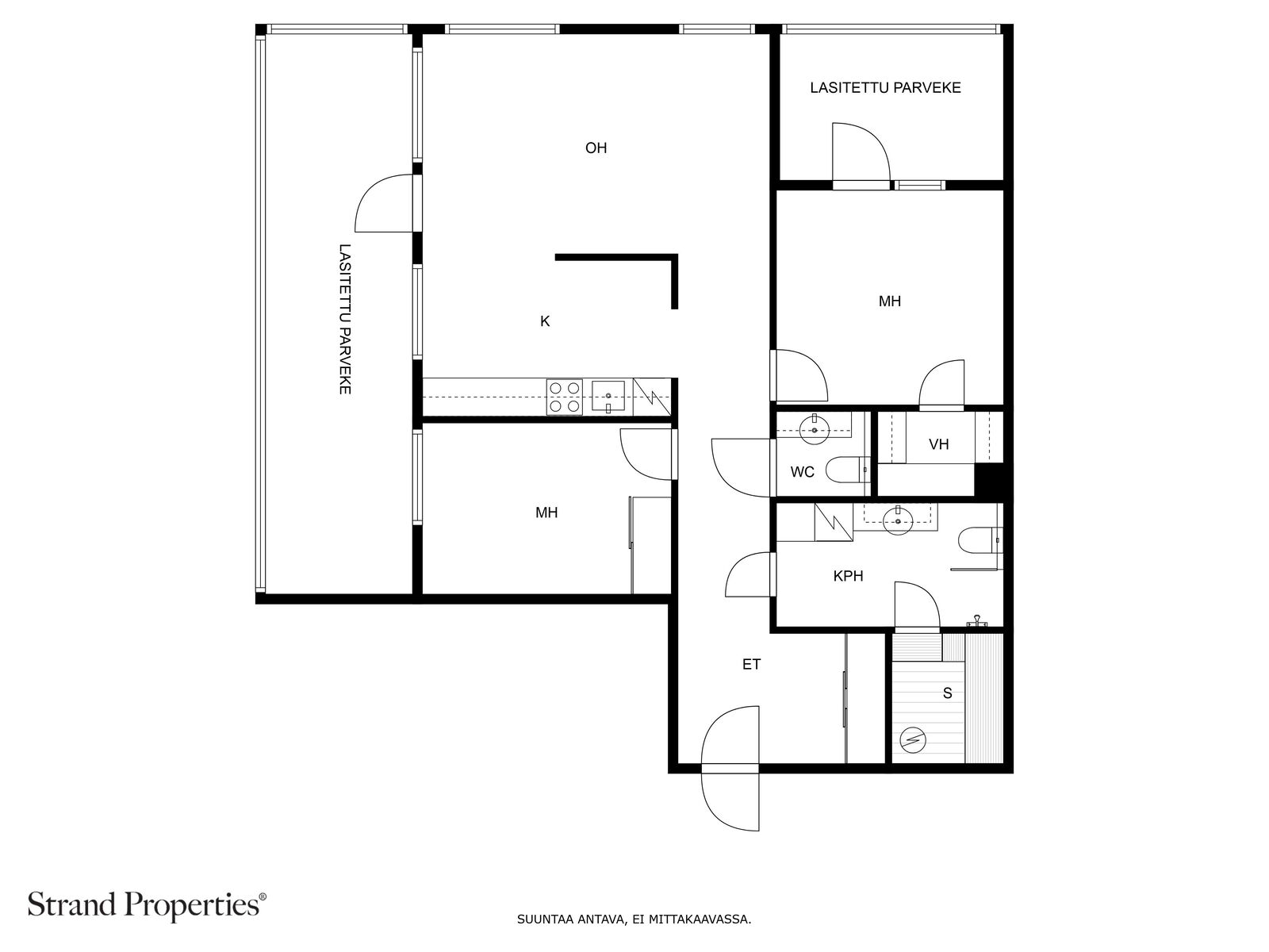 Asunnon pohjaratkaisu on selkeä ja käytännöllinen: keittiö ja olohuone muodostavat avoimen ja ilmavan kokonaisuuden, jossa valo kulkee kauniisti läpi tilan. Kaksi makuuhuonetta tarjoavat joustavuutta asumiseen. Saunallinen kylpyhuone ja erillinen wc täydentävät asumismukavuuden.