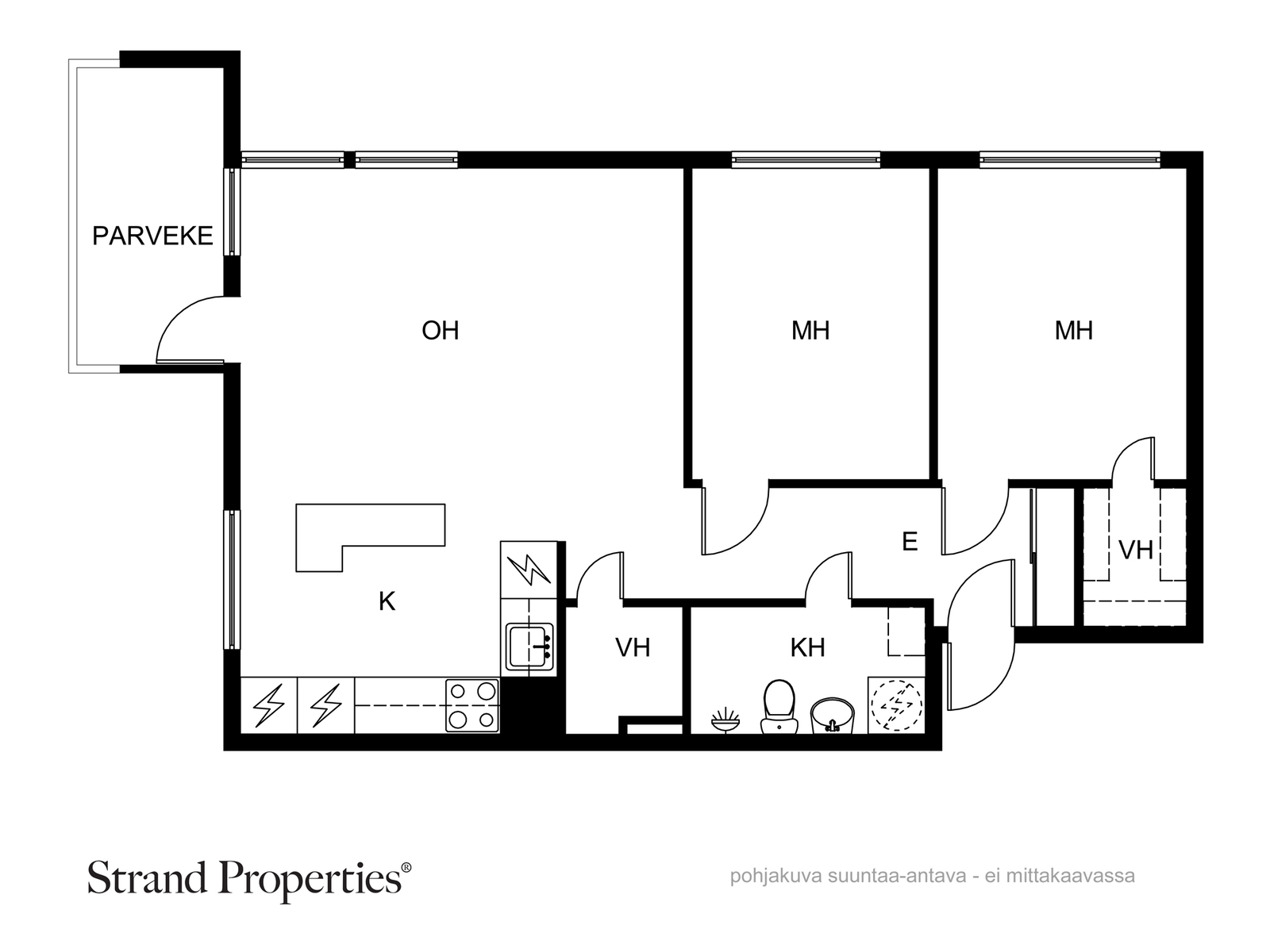 Asunnossa on kaksi reilunkokoista makuuhuonetta ja kaksi vaatehuonetta sekä yhtenäinen parkettilattia. Tilava ja moderni kylpyhuone on uusittu putkiremontin (2018) yhteydessä.