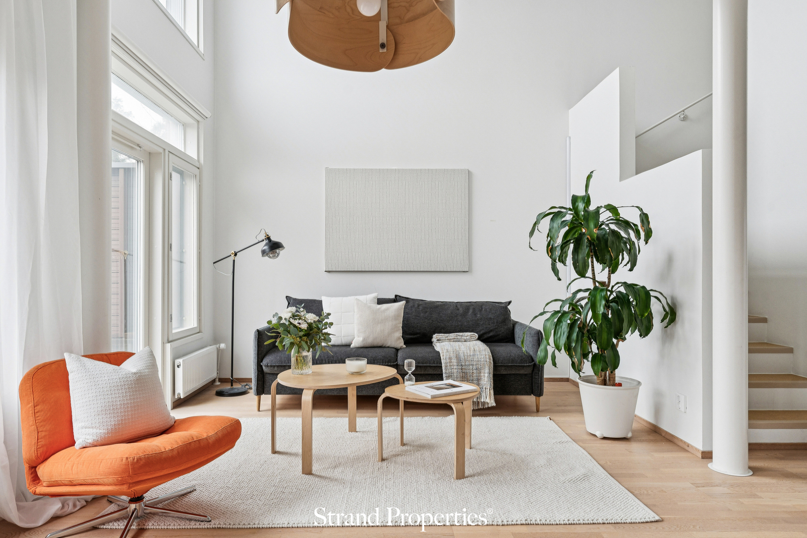 Alakerta on oleskelun ytimenä ja tila on avoin ikkunoiden tuodessa valoa, joka korostuu olohuoneen korkeassa tilassa. Tilaa on selkeästi rytmitetty ja keittiössä on riittävästi tilaa ja ruokailutilan saa mukavasti ikkunan ääreen. Oleskelutila on reilun kokoinen ja tänne mahtuu niin pianoa kuin lasten puuhailutilaa. Sekä oleskelutilasta on käynti viihtyisälle ja helppohoitoiselle terassipihalle. Alakerrassa on tilava eteinen, josta on käynti kylpyhuone-wc:hen. Yläkerrassa on kaksi makuuhuonetta, joissa on säilytystilaa. Tilava kylpyhuone, jonka yhteydessä on ikkunallinen sauna. Takapihalla on huoneiston varasto. Yhtiöstä on mahdollisuus saada yksi autopaikka.