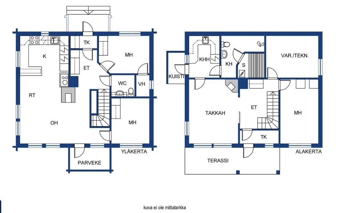 Yläkerran olohuone, ruokatila ja keittiö ovat kaikki yhtä isoa tilaa. Keittiössä on lämmön lähteenä sekä ruuan valmistamiseen puuhella. Maalämmön ansiosta asunnon lämmityskustannukset saadaan pidettyä edullisina. Ruokailutilasta on kulku parvekkeelle. Parveke toimii kesäisin lisähuoneena, missä on reilusti tilaa niin grillille kuin pihakalusteillekkin. Parvekkeelta aukeaa upeat pelto ja järvi maisemat.