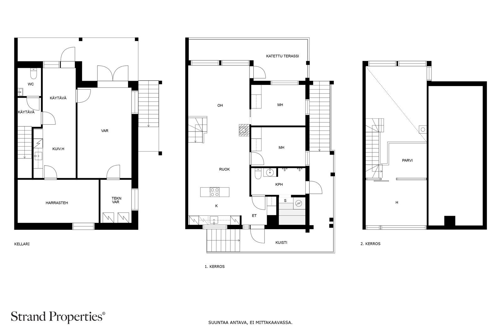 Tämä upea kolmen kerroksen paritalohuoneisto hurmaa tyylillään ja toimivuudellaan. Keskikerroksessa sijaitsee pääsisäänkäynti, moderni ja hyvin varusteltu keittiö, jossa on aamiaiskaappi, integroidut kodinkoneet ja näyttävät mustat kalusteet - täydellinen kontrasti muuten vaaleaan skandinaaviseen sisustukseen. Oleskelutila kohoaa korkeiden ikkunoiden ansiosta valoisaksi ja avaraksi, ja huoneistojen välinen eläväpintainen seinä tuo sisustukseen kauniin valon mukana vaihtelevan yksityiskohdan.