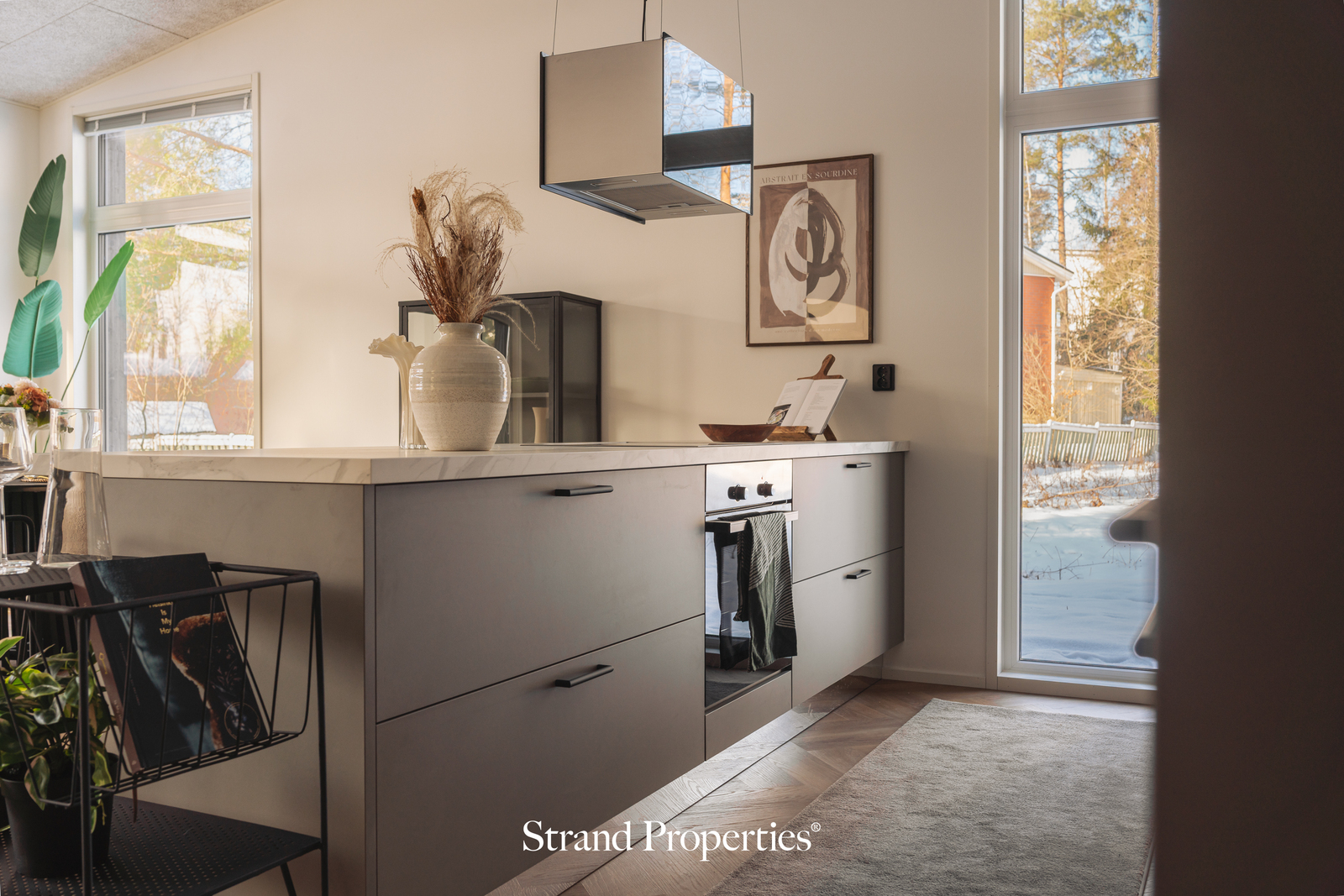 Täällä arki on helppoa, valoisaa ja kaunista – juuri niin kuin sen kuuluukin olla. Rakennus on tyylikkäästi tumma ja sopii hyvin alueelle luoden tyylikkään ja näyttävän kokonaisuuden.