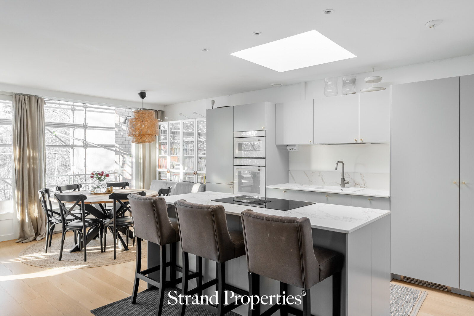 Sisätiloissa vallitsee harmoninen ja kodikas tunnelma. Runsas luonnonvalo korostaa oleskelutilojen avaruutta ja olohuoneen takka tuo lämpöä ja tunnelmaa. Keittiö on varusteltu nykyaikaisilla, integroiduilla kodinkoneilla – induktioliesi, erillinen uuni ja mikroaaltouuni palvelevat vaativampaakin kotikokkia. Keittiön kattoikkuna tuo tilaan kauniisti luonnonvaloa ja muistuttaa samalla rakennusajan parhaista arkkitehtonisista ratkaisuista.