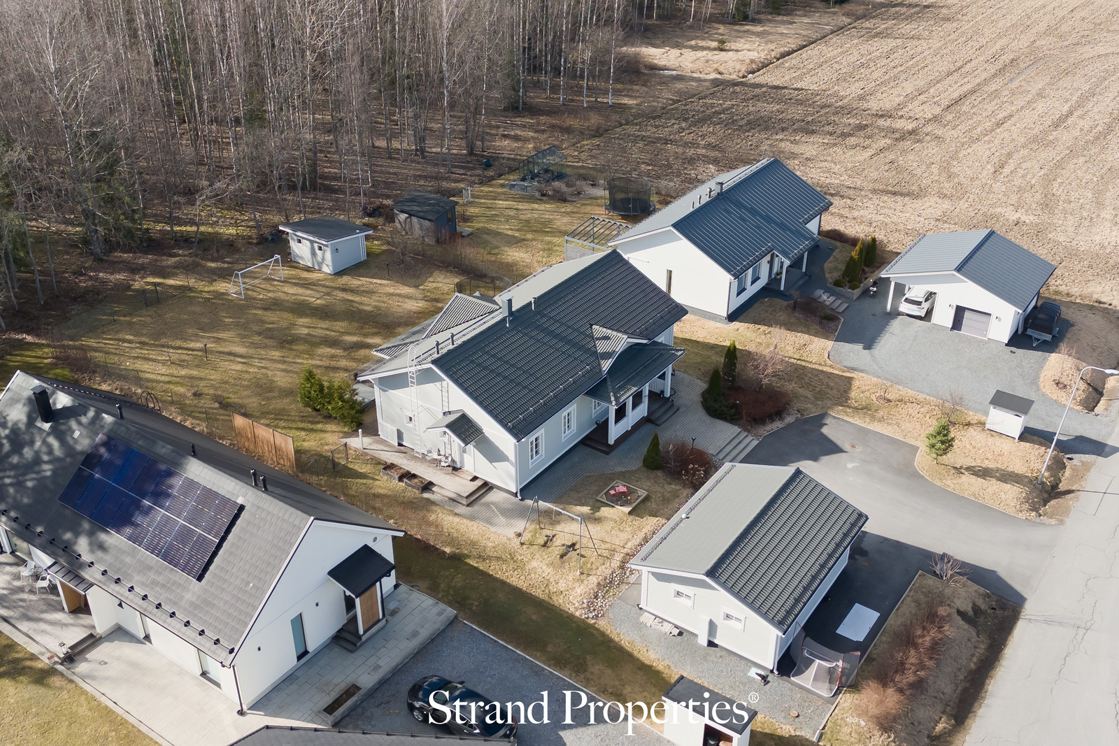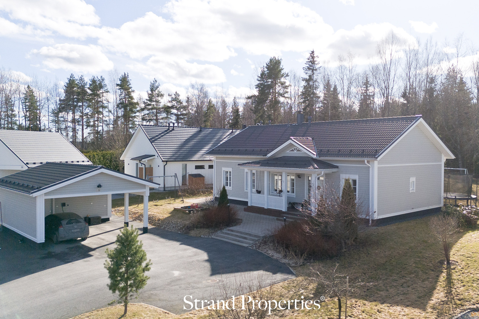Suuri ja monipuolinen piha tarjoaa valmiit puitteet leikeille ja yhdessäololle. Pihalla on laadukkaat keinut ja iso hiekkalaatikko. Takapihan nurmikenttä sopii pihapeleihin, ja etupiha on viimeistelty asfaltoinnilla ja laatoituksilla. Puutarhassa kasvavat viinimarjapensaat, pensasmustikat sekä omena-, kirsikka- ja luumupuut. Raja-aitoina toimiva marjatuomipihlaja antaa näkösuojan lisäksi herkullisen marjasadon. Poreallas ja isot terassit kruunaavat kokonaisuuden. Pihalla on lisäksi kahdelle autolle tilava autokatos sekä sähköauton latauspaikka.