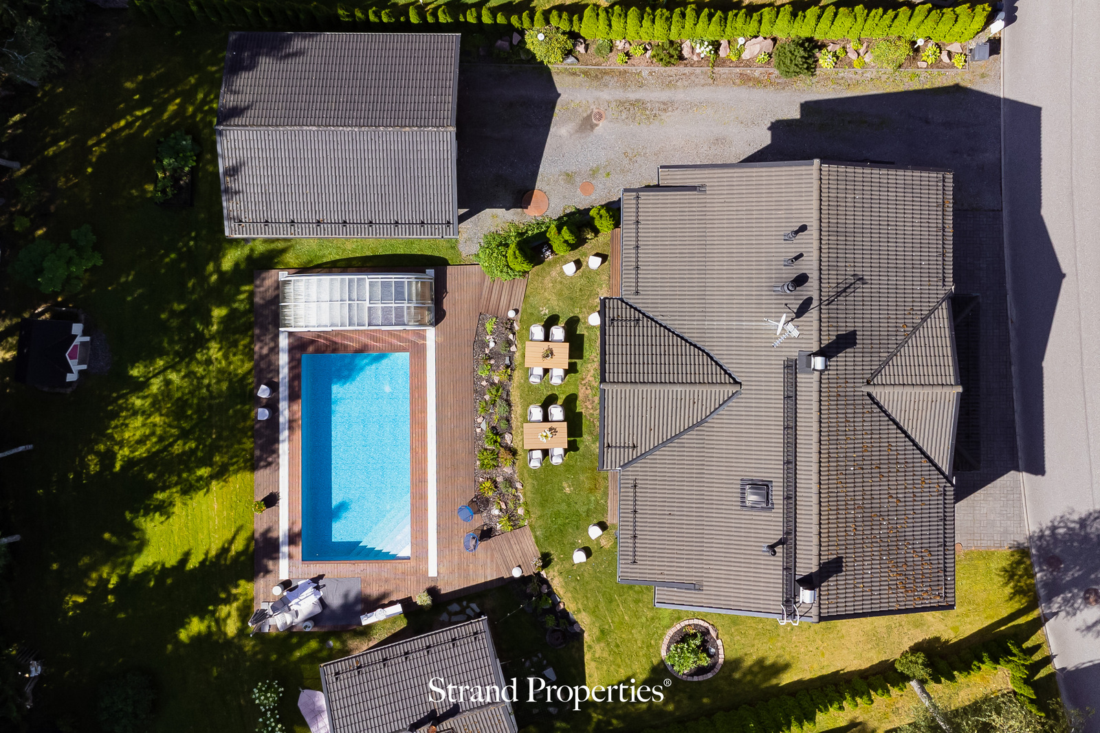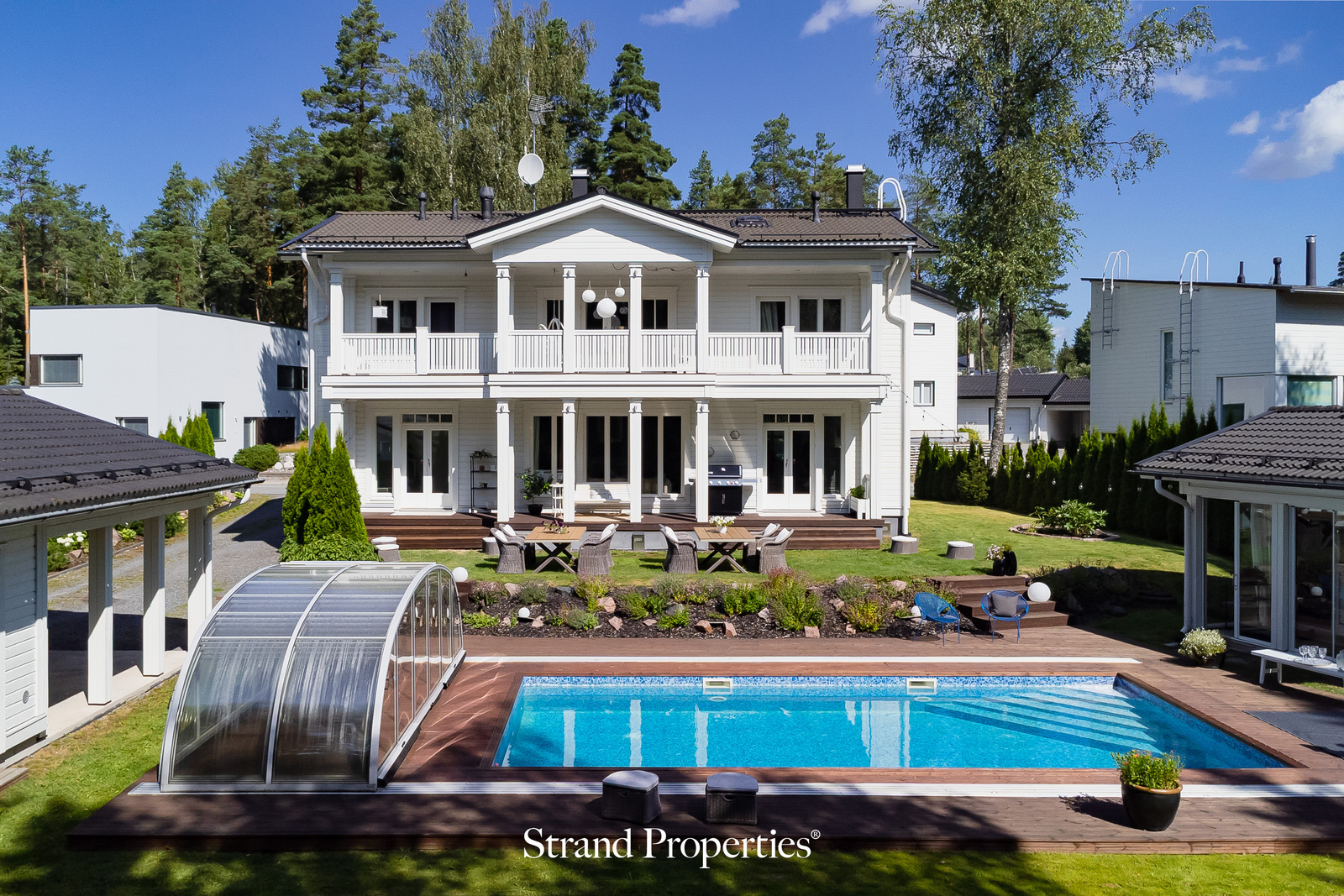 Vuonna 2009 rakennettu koti seisoo ylväänä puistoalueeseen rajoittuvalla tontilla, päättyvän tien varrella. Viimeistä piirtoa myöden viimeistelty pihamaa uima-altaineen ja pihasaunoineen kutsuu viettämään aikaa ja mahdollistaa monenlaiset aktiviteetit. Autotallin ja -katoksen yhdistelmä lämpimällä varastotilalla tuo mukavuutta arkeen. Energiatehokas maalämpö ja vesikiertoinen lattialämmitys huolehtivat kodin lämmityksestä.
