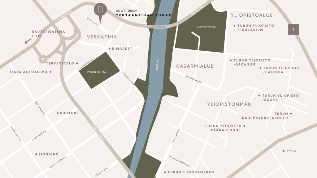 Alue sykkii urbaania elämää ja kehittyvää kaupunkikuvaa. Täällä asut vain kävelymatkan päässä korkeakouluista, TYKSistä ja Turun keskustan kattavista palveluista. Idyllinen Aurajokiranta kulttuuri- ja ravintolatarjontoineen ja elämää sykkivä Kauppatori ovat myös vain muutaman minuutin päässä.